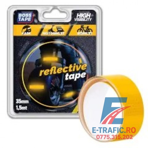 Bandă adezivă reflectorizantă de culoarea galben, tip fagure, cu dimensiunile de 3.5cm x 1.5m.