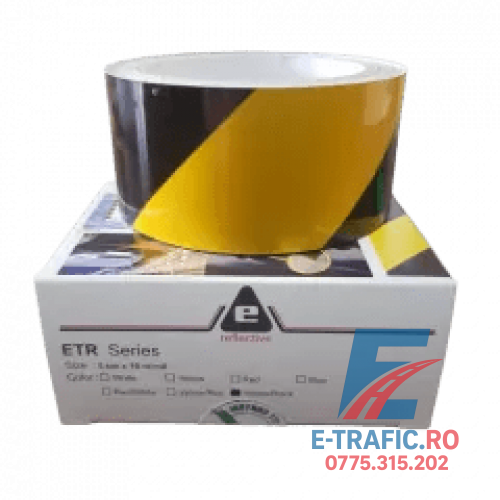 Bandă reflectorizantă adezivă (galben/negru) cu dimensiunile de 5cm x 10m și reflexia de 80cd/lux.
